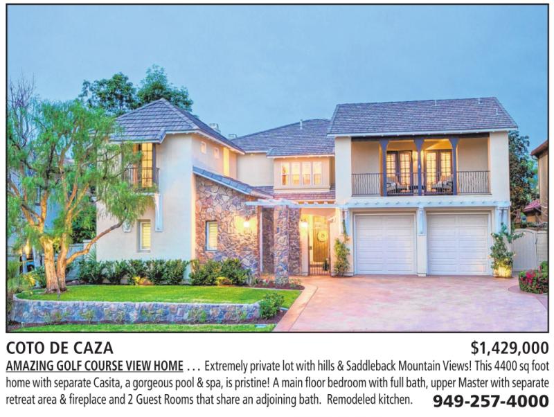 COTO DE CAZA $1,429,000 AMAZING GOLF COURSE VIEW HOME … Extremely privatelot with hills&Saddleback Mountain Views! This 4400 sq foot home with separateCasita,agorgeous pool&spa, is pristine!Amain floorbedroom with full bath, upperMasterwithseparate retreat area &fireplace and2Guest Roomsthat share an adjoining bath. Remodeled kitchen. 949-257-4000