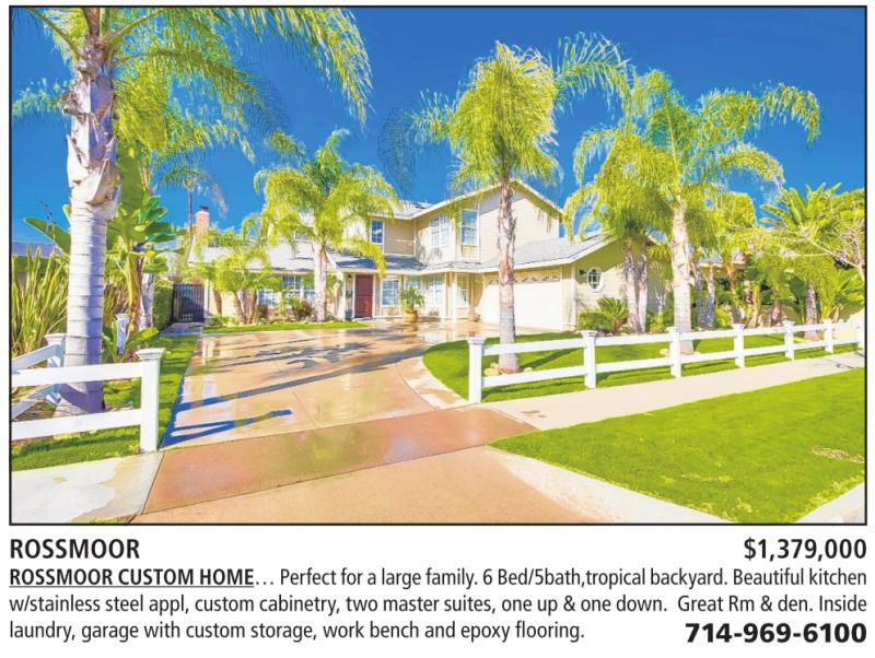 ROSSMOOR $1,379,000 ROSSMOOR CUSTOMHOME…Perfect for alarge family.6Bed/5bath,tropical backyard. Beautifulkitchen w/stainlesssteel appl, customcabinetry,two master suites, one up &one down. Great Rm &den. Inside laundry, garagewithcustomstorage, work benchand epoxyflooring. 714-969-6100