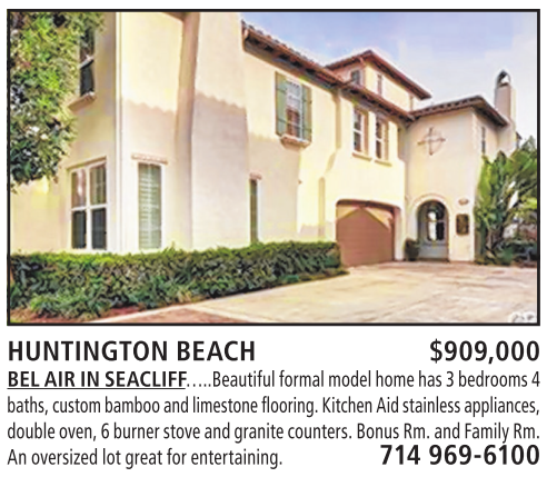 HUNTINGTON BEACH $909,000 BEL AIR IN SEACLIFF…..Beautifulformal model home has 3bedrooms4 baths, custombamboo andlimestone flooring.Kitchen Aidstainless appliances, double oven, 6burnerstove andgranitecounters. Bonus Rm.and Family Rm. An oversizedlot great forentertaining. 714 969-6100