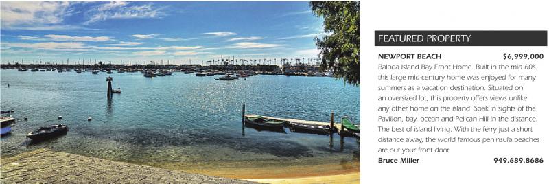 FEATURED PROPERTY NEWPORT BEACH $6,999,000 Balboa Island Bay Front Home. Built in the mid 60’s this large mid-century home was enjoyed for many summers as a vacation destination. Situated on an oversized lot, this property offers views unlike any other home on the island. Soak in sights of the Pavilion, bay, ocean and Pelican Hill in the distance. The best of island living. With the ferry just a short distance away, the world famous peninsula beaches are out your front door. Bruce Miller 949.689.8686
