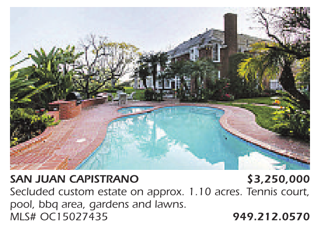 SAN JUAN CAPISTRANO $3,250,000 Secluded custom estate on approx. 1.10 acres. Tennis court, pool, bbq area, gardens and lawns. MLS# OC15027435 949.212.0570