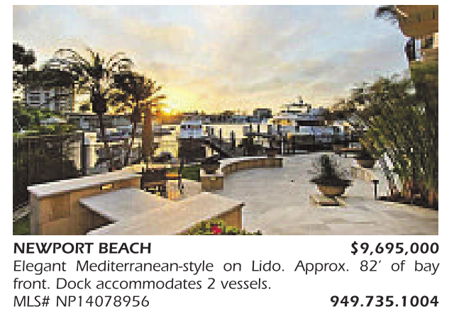NEWPORT BEACH $9,695,000 Elegant Mediterranean-style on Lido. Approx. 82’ of bay front. Dock accommodates 2 vessels. MLS# NP14078956 949.735.1004