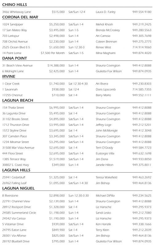 3466 Whirlaway Lane $515,000 Sat/Sun 12-4 Laura D. Farley 949.554.9180 CORONA DEL MAR 1024 Sandpiper $5,250,000 Sat/Sun 1-4 Mehdi Khosh 949.219.2425 17 San Mateo Way $3,495,000 Sun 1-5 Brenda McCroskey 949.280.5563 703 Larkspur $2,498,000 Sun 1-4 Art Camoia 949.305.7698 708 Orchid Avenue $2,230,000 Sun 1-4 Coleen Brennan 949.275.2775 2525 Ocean Blvd E-5 $1,650,000 Sun 12:30-3 Renee West 714.914.9060 14 Point Loma $7,500 Per Month Sat/Sun 1-5 Mina Maghami 949.874.4020 DANA POINT 31 Beach View Avenue $14,388,000 Sun 1-4 Shauna Covington 949.412.8088 6Midnight Lane $2,425,000 Sun 1-4 Giulietta Fox Wilson 949.874.0935 IRVINE 1Clear Creek $1,740,000 Sat 12:30-4:30 Art Rivera 949.230.8303 1Savannah $938,000 Sat 12-4 Doris Lipscomb 714.585.7355 17255 Chesnut $710,000 Sat 1-4 Barry Marks 949.552.1111 LAGUNA BEACH 154 Thalia Street $6,995,000 Sat/Sun 1-4 Shauna Covington 949.412.8088 36 Lagunita Drive $5,495,000 Sat 1-4 Shauna Covington 949.412.8088 31102 Brooks Street $4,895,000 Sat/Sun 1-4 Shauna Covington 949.412.8088 1712 Thurston Drive $3,995,000 Sat/Sun 1-4 Jeffrey Loge 949.212.5201 1572 Skyline Drive $3,695,000 Sat 1-4 John McMonigle 949.412.3048 307 Camden Place $3,345,000 Sat/Sun 1-4 Shauna Covington 949.412.8088 1234 Miramar Street $3,295,000 Sat/Sun 1-4 Shauna Covington 949.412.8088 31508 Mar Vista Avenue $2,695,000 Sat 1-4 Terri O’Grady 949.584.7723 444 Flora Street $2,695,000 Sat/Sun 1-4 Eustorgio Villa 949.632.1698 1385 Terrace Way $1,519,000 Sat/Sun 1-4 Jim Doria 949.933.8050 30802 S. Coast Hwy $349,000 Sun 1-4 Janelle Hilton 949.375.8011 LAGUNA HILLS 25941 Cedarbluff $1,325,000 Sat 1-4 Teresa Wakefield 949.463.2692 26962 Falling Leaf $1,095,000 Sat/Sun 1-4:30 Jim Bishop 949.464.8136 LAGUNA NIGUEL 8Riverstone $2,898,000 Sun 12:30-3:30 Michael DiPilla 949.234.5625 22791 Channel View $2,139,000 Sun 1-4 Shauna Covington 949.412.8088 28912 Rockport Drive $1,328,000 Sat 1-4 Liz Hansche 949.295.9373 24585 Summerland Circle $1,198,000 Sun 1-4 Sandi Lesko 949.212.7080 24542 Via Carissa $1,190,000 Sun 1-4 Liz Hansche 949.295.9373 5Vistamar Drive $939,000 Sat/Sun 1-4 Ken Hanzlik 949.338.1666 24795 Eaton Lane $849,900 Sat 1-4 Terry Klein 949.212.2039 28301 Via Alfonse $825,000 Sat/Sun 1-4 Jim Bishop 949.464.8136 28192 Bluebell Drive $795,000 Sun 1-4 Giulietta Fox Wilson 949.874.0935