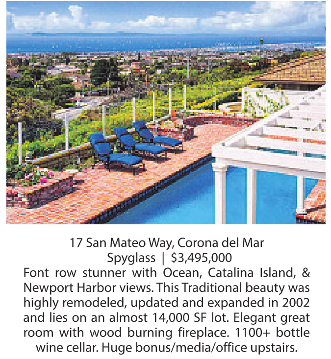17 San MateoWay, Corona del Mar Spyglass | $3,495,000 Font row stunner with Ocean, Catalina Island, & Newport Harbor views. This Traditional beauty was highly remodeled, updated and expanded in 2002 and lies on an almost 14,000 SF lot. Elegant great room with wood burning fireplace. 1100+ bottle wine cellar. Huge bonus/media/office upstairs.