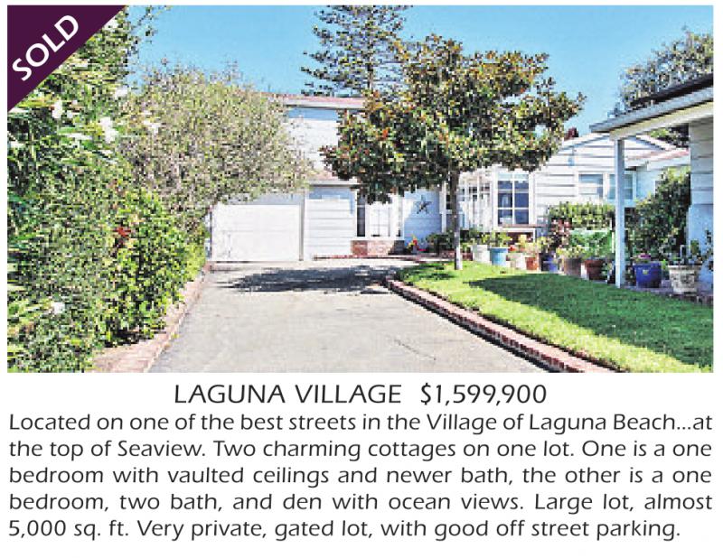LAGUNA VILLAGE $1,599,900 Located on one of the best streets in the Village of Laguna Beach...at the top of Seaview. Two charming cottages on one lot. One is a one bedroom with vaulted ceilings and newer bath, the other is a one bedroom, two bath, and den with ocean views. Large lot, almost 5,000 sq. ft. Very private, gated lot, with good off street parking.