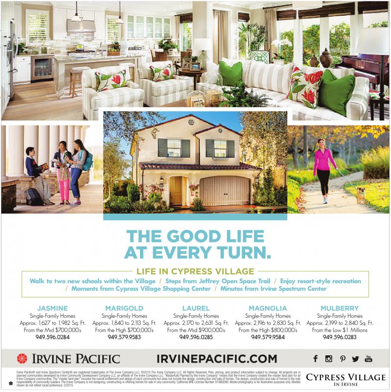Irvine Pacific® and Irvine Spectrum Center® are registered trademarks of The Irvine Company LLC. ©2015The Irvine Company LLC. All Rights Reserved. Plan, pricing, and product information subject to change. All projects are in plannedcommunities developedbyIrvineCommunity Development Company LLC, an affiliate of The Irvine CompanyLLC.“Masterfully Planned by the IrvineCompany” meansthatthe Irvine Company created the master land plan forall IrvineCompany communities.The “master land plan” includes theoverall entitlement and designofeach communitybut does notinclude thedesign, construction and saleofhomes. The design, construction andsaleofhomes is the sole responsibilityofcommunity builders. The IrvineCompanyisnot designing,constructing or offering homes forsaleinany community.California BRE License Number 01889266.Model photographyisfor illustrative purposesonly. Models shown do notreflect racial preference. 2/2015