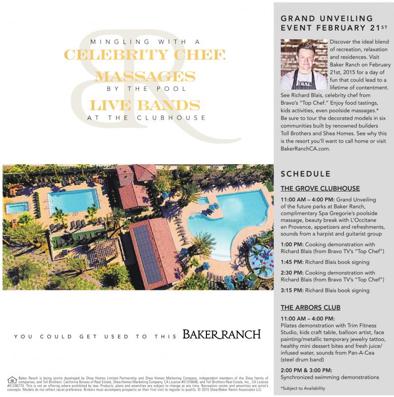 See Richard Blais, celebrity chef from Bravo’s “Top Chef.” Enjoy food tastings, kids activities, even poolside massages.* Be sure to tour the decorated models in six communities built by renowned builders Toll Brothers and Shea Homes. See why this is the resort you’ll want to call home or visit BakerRanchCA.com.