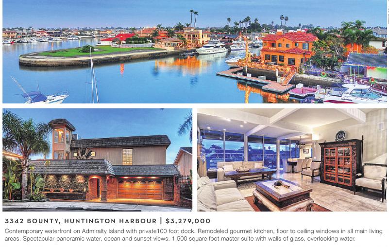 3342 BOUNTY, HUNTINGTON HARBOUR | $3,279,000 Contemporary waterfront on Admiralty Island with private100 foot dock. Remodeled gourmet kitchen, floor to ceiling windows in all main living areas. Spectacular panoramic water, ocean and sunset views. 1,500 square foot master suite with walls of glass, overlooking water.