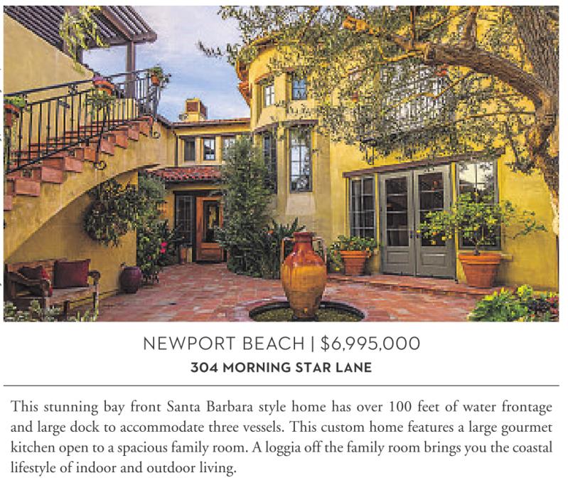 22 NEWPORT BEACH | $6,995,000 304 MORNING STAR LANE This stunning bay front Santa Barbara style home has over 100 feet of water frontage and large dock to accommodate three vessels. This custom home features a large gourmet kitchen open to a spacious family room. A loggia off the family room brings you the coastal lifestyle of indoor and outdoor living.