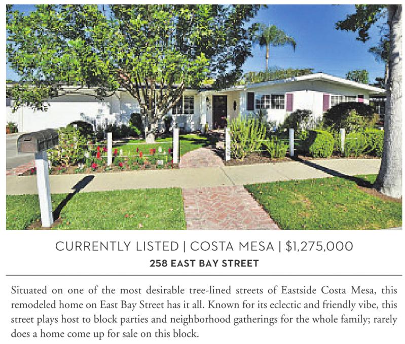 CURRENTLY LISTED | COSTA MESA | $1,275,000 258 EAST BAY STREET Situated on one of the most desirable tree-lined streets of Eastside Costa Mesa, this remodeled home on East Bay Street has it all. Known for its eclectic and friendly vibe, this street plays host to block parties and neighborhood gatherings for the whole family; rarely does a home come up for sale on this block.