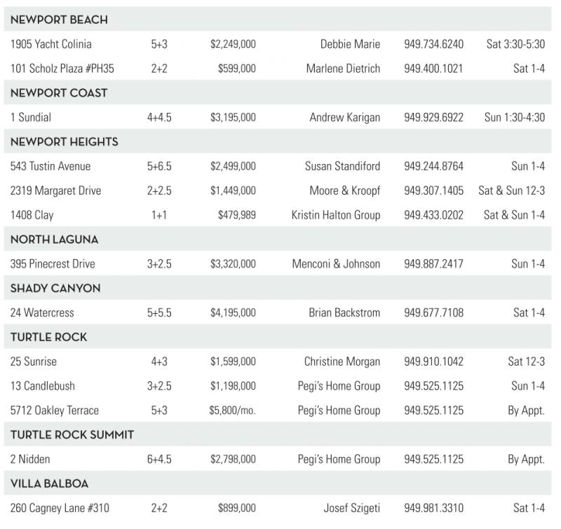 1905 Yacht Colinia 5+3 $2,249,000 Debbie Marie 949.734.6240 Sat 3:30-5:30 101 Scholz Plaza #PH35 2+2 $599,000 Marlene Dietrich 949.400.1021 Sat 1-4 NEWPORTCOAST 1Sundial 4+4.5 $3,195,000 Andrew Karigan 949.929.6922 Sun 1:30-4:30 NEWPORTHEIGHTS 543 Tustin Avenue 5+6.5 $2,499,000 Susan Standiford 949.244.8764 Sun 1-4 2319 Margaret Drive 2+2.5 $1,449,000 Moore &Kroopf 949.307.1405 Sat &Sun 12-3 1408 Clay 1+1 $479,989 Kristin Halton Group 949.433.0202 Sat &Sun 1-4 NORTH GUNA 395 Pinecrest Drive 3+2.5 $3,320,000 Menconi &Johnson 949.887.2417 Sun 1-4 SHADYCANYON 24 Watercress 5+5.5 $4,195,000 Brian Backstrom 949.677.7108 Sat 1-4 TURTLE ROCK 25 Sunrise 4+3 $1,599,000 Christine Morgan 949.910.1042 Sat 12-3 13 Candlebush 3+2.5 $1,198,000 Pegi’sHome Group 949.525.1125 Sun 1-4 5712 Oakley Terrace 5+3 $5,800/mo. Pegi’sHome Group 949.525.1125 By Appt. TURTLE ROCK SUMMIT 2Nidden 6+4.5 $2,798,000 Pegi’sHome Group 949.525.1125 By Appt. VIL BALBOA 260 Cagney Lane #310 2+2 $899,000 Josef Szigeti 949.981.3310 Sat 1-4