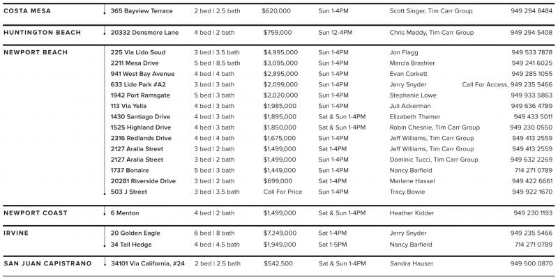 NEWPORT BEACH 225 Via Lido Soud 3 bed | 3.5 bath $4,995,000 Sun 1-4PM Jon Flagg 949 533 7878 2211 Mesa Drive 5 bed | 8.5 bath $3,095,000 Sun 1-4PM Marcia Brashier 949 241 6025 941 West Bay Avenue 4 bed | 4 bath $2,895,000 Sun 1-4PM Evan Corkett 949 285 1055 633 Lido Park #A2 3 bed | 3 bath $2,099,000 Sun 1-4PM Jerry Snyder Call For Access, 949 235 5466 1942 Port Ramsgate 5 bed | 3 bath $2,020,000 Sun 1-4PM Stephanie Lowe 949 933 5863 113 Via Yella 4 bed | 3 bath $1,985,000 Sun 1-4PM Juli Ackerman 949 636 4789 1430 Santiago Drive 4 bed | 3 bath $1,895,000 Sat & Sun 1-4PM Elizabeth Thamer 949 433 5011 1525 Highland Drive 4 bed | 3 bath $1,850,000 Sat & Sun 1-4PM Robin Chesnie, Tim Carr Group 949 230 0550 2316 Redlands Drive 4 bed | 4 bath $1,675,000 Sun 1-4PM Jeff Williams, Tim Carr Group 949 413 2559 2127 Aralia Street 3 bed | 2 bath $1,499,000 Sat 1-4PM Jeff Williams, Tim Carr Group 949 413 2559 2127 Aralia Street 3 bed | 2 bath $1,499,000 Sun 1-4PM Dominic Tucci, Tim Carr Group 949 632 2269 1737 Bonaire 5 bed | 3 bath $1,449,000 Sun 1-4PM Nancy Barfield 714 271 0789 20281 Riverside Drive 3 bed | 2 bath $699,000 Sat 1-4PM Marlene Hassel 949 422 6661 503 J Street 3 bed | 3.5 bath Call For Price Sun 1-4PM Tracy Bowie 949 922 1670
