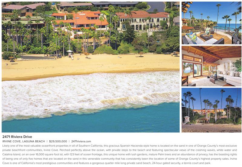 IRVINE COVE, LAGUNA BEACH | $29,500,000 | 2471riviera.com Likely one of the most valuable oceanfront properties in all of Southern California, this gracious Spanish Hacienda style home is located on the sand in one of Orange County’s most exclusive private beachfront communities, Irvine Cove. Perched perfectly above the ocean, with private steps to the beach and featuring spectacular views of the crashing waves, white water and Catalina Island, on an over 16,000 square foot lot, with 123 feet of ocean frontage, this unique home with lush gardens, mature Palm trees and an abundance of privacy, has the boasting rights of being one of only five homes that are located on the sand in this venerable community that has consistently been the location of some of Orange County’s highest property sales. Irvine Cove is one of California’s most prestigious communities and features a gorgeous quarter mile long private sand beach, 24-hour gated security, a tennis court and park.