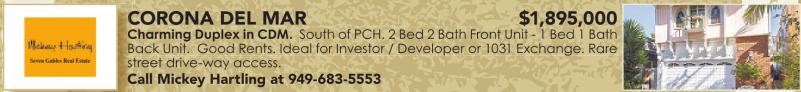Charming Duplex in CDM. South of PCH. 2 Bed 2 Bath Front Unit - 1 Bed 1 Bath Back Unit. Good Rents. Ideal for Investor / Developer or 1031 Exchange. Rare street drive-way access. Call Mickey Hartling at 949-683-5553