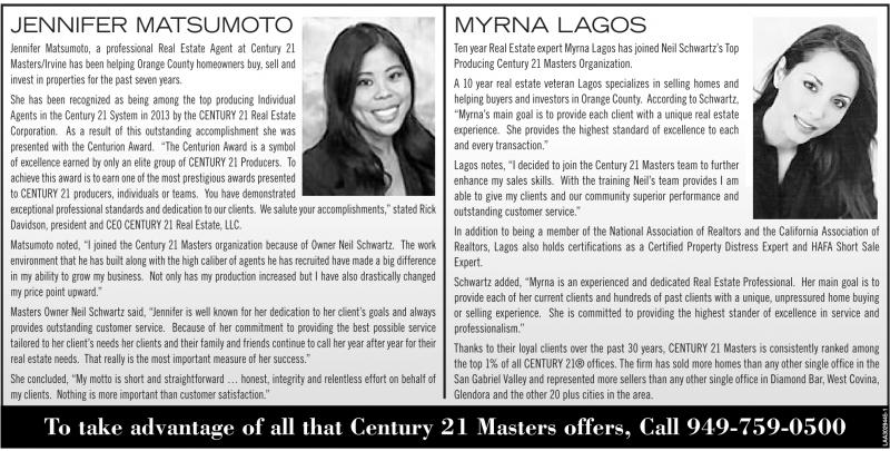 Matsumoto noted, “I joined the Century 21 Masters organization because of Owner Neil Schwartz. The work environmentthathehas builtalong with thehighcaliber of agents he has recruited havemadeabig difference in my ability to grow my business. Not only has my production increased but I have also drastically changed my pricepoint upward.”
