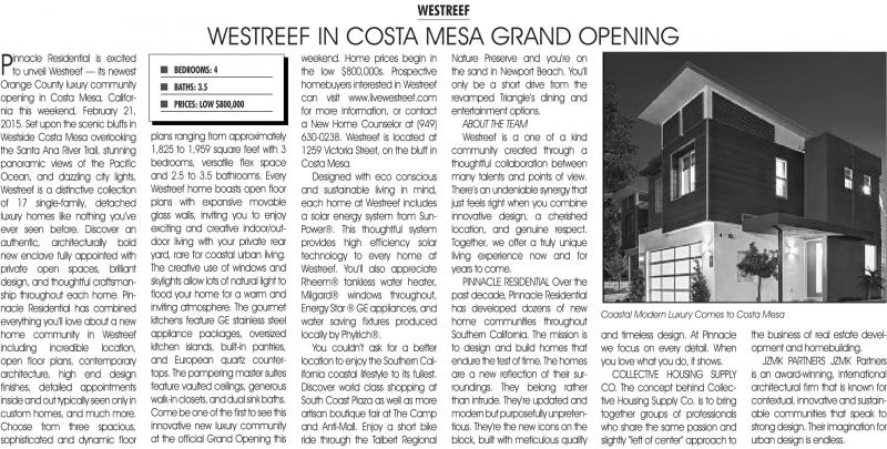 residential is excited to unveil Westreef — its newest orange County luxury community opening in Costa Mesa, California this weekend, February 21, 2015. Set uponthe scenic bluffs in Westside Costa Mesa overlooking the Santa Ana river Trail, stunning panoramic views of the Pacific ocean, and dazzling city lights, Westreef is a distinctive collection of 17 single-family, detached luxury homes like nothing you’ve ever seen before. discover an authentic, architecturally bold new enclave fully appointed with private open spaces, brilliant design, and thoughtful craftsmanship throughout each home. Pinnacle residential has combined everything you’ll love about anew home community in Westreef including incredible location, open floor plans, contemporary architecture, high end design finishes, detailed appointments insideand out typically seenonly in custom homes, and much more. Choose from three spacious, sophisticated and dynamic floor
