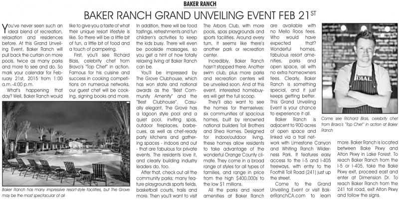 never seen such an ideal blend of recreation, relaxation and residences before. At this Grand Unveiling Event, Baker Ranch will pull back the curtain on more pools, twice as many parks and more to see and do. So mark your calendar for February 21st, 2015 from 1:00 a.m.-4:00 p.m.