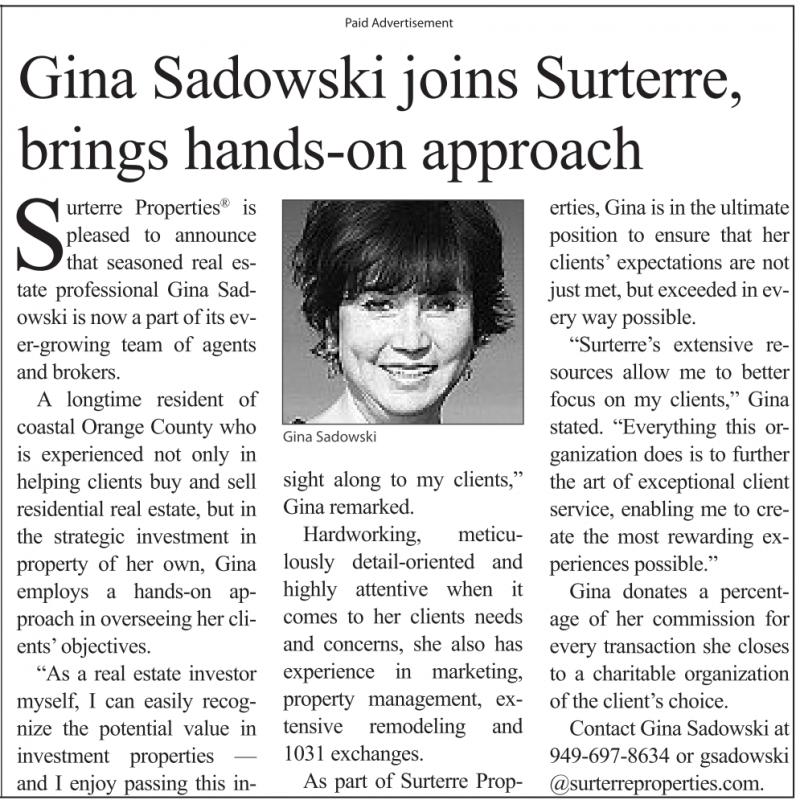 Contact Gina Sadowski at 949-697-8634 or gsadowski @surterreproperties.com.