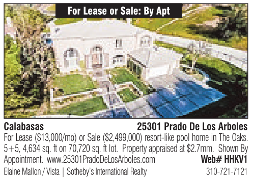 For Lease or Sale: By Apt Calabasas 25301 Prado De LosArboles Elaine Mallon /Vista |Sotheby’s InternationalRealty 310-721-7121 For Lease ($13,000/mo) or Sale ($2,499,000) resort-like pool home in TheOaks. 5+5, 4,634 sq. ft on 70,720 sq. ft lot. Property appraised at $2.7mm. ShownBy Appointment. www.25301PradoDeLosArboles.com Web# HHKV1