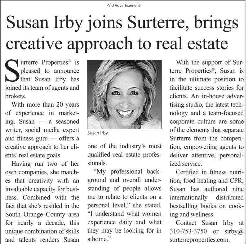 Surterre Properties ® is pleased to announce that Susan Irby has joined its team of agents and brokers. With more than 20 years of experience in marketing, Susan — a seasoned writer, social media expert and fitness guru — offers a creative approach to her clients’ real estate goals. Having run two of her own companies, she matches that creativity with an invaluable capacity for business. Combined with the fact that she’s resided in the South Orange County area for nearly a decade, this unique combination of skills and talents renders Susan Paid Advertisement Susan Irby joins Surterre, brings creative approach to real estate Susan Irby one of the industry’s most qualified real estate professionals. “My professional background and overall understanding of people allows me to relate to clients on a personal level,” she stated. “I understand what women experience daily and what they may be looking for in a home.” With the support of Surterre Properties ® , Susan is in the ultimate position to facilitate success stories for clients. An in-house advertising studio, the latest technology and a team-focused corporate culture are some of the elements that separate Surterre from the competition, empowering agents to deliver attentive, personalized service. Certified in fitness nutrition, food healing and CPR, Susan has authored nine internationally distributed bestselling books on cooking and wellness. Contact Susan Irby at 310-753-3750 or sirby@ surterreproperties.com.