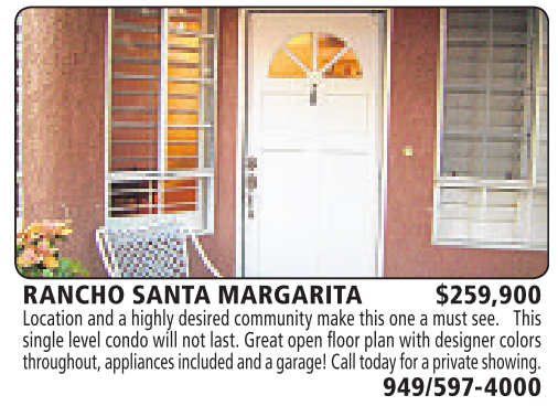 RANCHO SANTA MARGARITA $259,900 Location and ahighly desired community make this one amust see. This single level condowillnot last.Great open floor plan withdesignercolors throughout,appliancesincluded andagarage! Call todayfor aprivateshowing. 949/597-4000