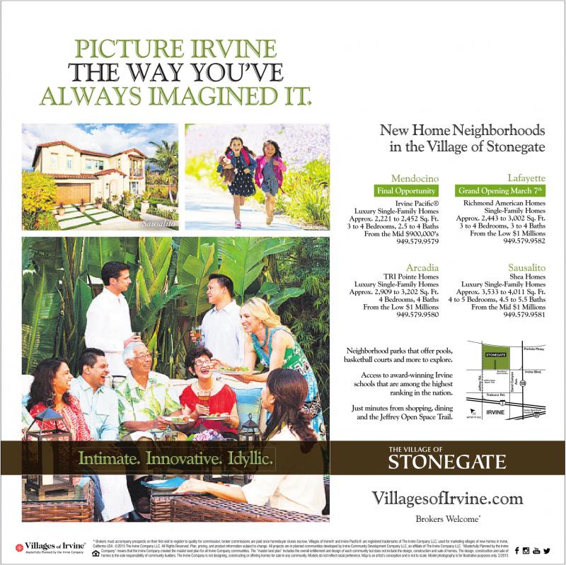 *Brokers must accompany prospects on their first visit to register to quality for commission; broker commissions are paid once homebuyer closes escrow.VillagesofIrvine® and Irvine Pacific® are registered trademarks of The Irvine Company LLC, used for marketing villages of new homes in Irvine, California USA.©2015 The Irvine Company LLC. All Rights Reserved. Plan, pricing, and product information subject to change. All projects are in planned communities developed by Irvine Community Development Company LLC, an affiliate of The Irvine Company LLC. “Masterfully Planned by the Irvine Company” means that the Irvine Company created the master land plan for all Irvine Company communities. The “master land plan” includes the overall entitlement and design of each community but does not include the design, construction and sale of homes. The design, construction and sale of homes is the sole responsibility of community builders. The Irvine Company is not designing, constructing or offering homes for sale in any community.Models do not reflect racial preference. Map is an artist’s conception and is not to scale. Model photography is for illustrative purposes only.2/2015