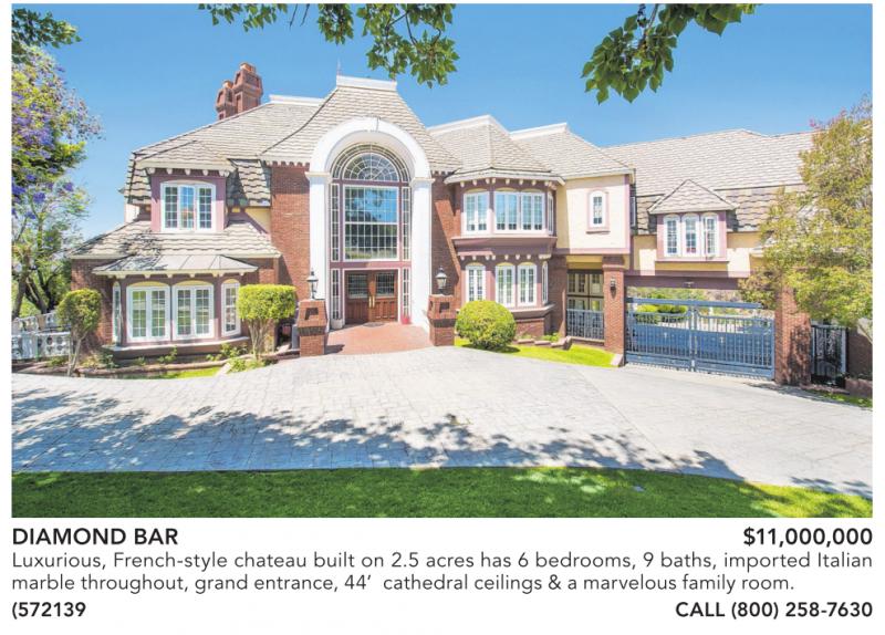 DIAMOND BAR $11,000,000 Luxurious, French-style chateau built on 2.5 acres has 6 bedrooms, 9 baths, imported Italian marble throughout, grand entrance, 44’ cathedral ceilings & a marvelous family room. (572139 CALL (800) 258-7630