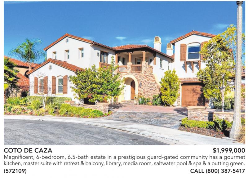 COTO DE CAZA $1,999,000 Magnificent, 6-bedroom, 6.5-bath estate in a prestigious guard-gated community has a gourmet kitchen, master suitewithretreat &balcony,library,media room,saltwaterpool&spa &aputting green. (572109) CALL (800) 387-5417