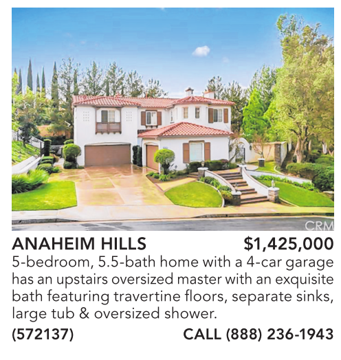 ANAHEIM HILLS $1,425,000 5-bedroom,5.5-bathhomewitha4-cargarage hasanupstairsoversized master withanexquisite bath featuringtravertinefloors,separate sinks, large tub & oversized shower. (572137) CALL (888) 236-1943