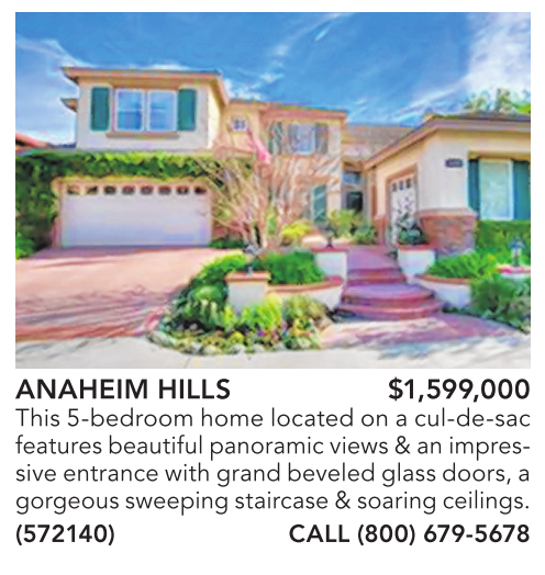 ANAHEIM HILLS $1,599,000 This 5-bedroom home located on a cul-de-sac features beautifulpanoramic views&animpressiveentrancewithgrand beveledglassdoors,a gorgeous sweepingstaircase &soaring ceilings. (572140) CALL (800) 679-5678