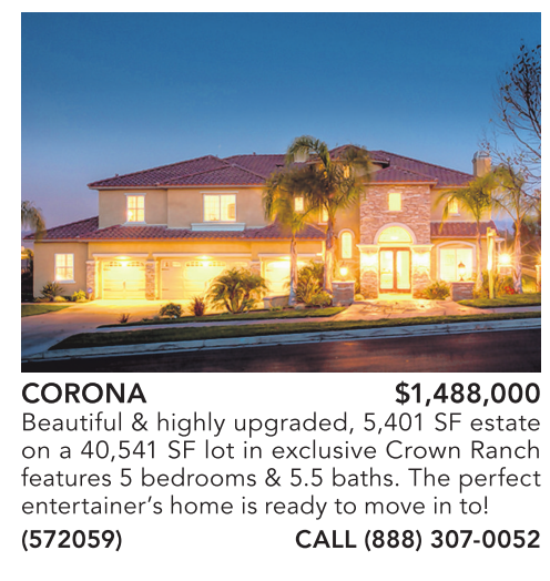 CORONA $1,488,000 Beautiful & highly upgraded, 5,401 SF estate on a 40,541 SF lot in exclusive Crown Ranch features 5 bedrooms & 5.5 baths. The perfect entertainer’s home is ready to move in to! (572059) CALL (888) 307-0052