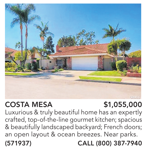 COSTA MESA $1,055,000 Luxurious &truly beautifulhomehas an expertly crafted, top-of-the-linegourmet kitchen; spacious &beautifullylandscaped backyard;Frenchdoors; an open layout & ocean breezes. Near parks. (571937) CALL (800) 387-7940