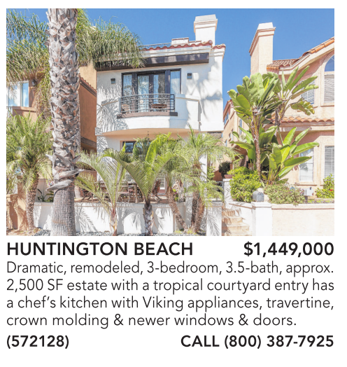HUNTINGTON BEACH $1,449,000 Dramatic,remodeled, 3-bedroom,3.5-bath, approx. 2,500SFestate with atropicalcourtyard entryhas achef’skitchen with Viking appliances, travertine, crown molding & newer windows & doors. (572128) CALL (800) 387-7925