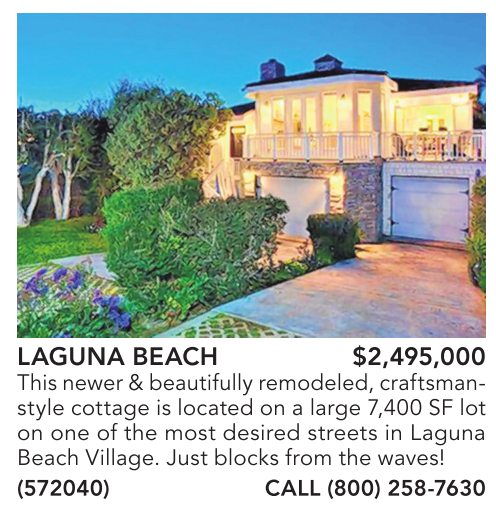 LAGUNA BEACH $2,495,000 This newer&beautifully remodeled, craftsmanstyle cottage is located on a large 7,400 SF lot on one of the most desired streets in Laguna Beach Village. Just blocks from the waves! (572040) CALL (800) 258-7630