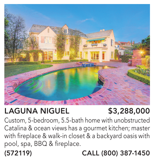 LAGUNA NIGUEL $3,288,000 Custom, 5-bedroom,5.5-bathhomewithunobstructed Catalina &ocean viewshas agourmet kitchen; master with fireplace &walk-in closet &abackyard oasis with pool, spa, BBQ & fireplace.