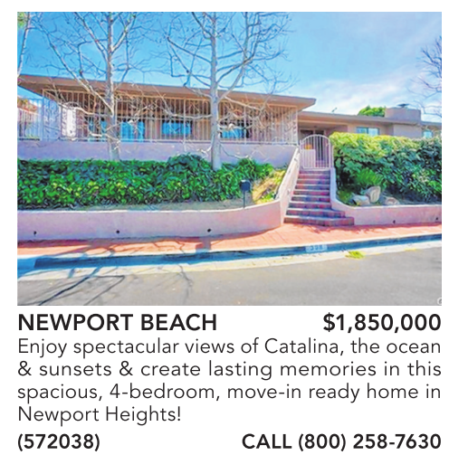 NEWPORT BEACH $1,850,000 Enjoy spectacular views of Catalina, the ocean & sunsets & create lasting memories in this spacious, 4-bedroom, move-in ready home in Newport Heights! (572038) CALL (800) 258-7630