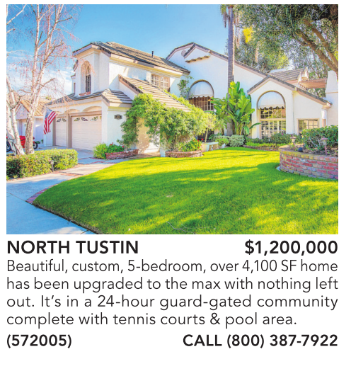 NORTH TUSTIN $1,200,000 Beautiful,custom, 5-bedroom,over4,100 SF home hasbeenupgradedtothe maxwithnothing left out. It’s in a 24-hour guard-gated community complete with tennis courts & pool area. (572005) CALL (800) 387-7922