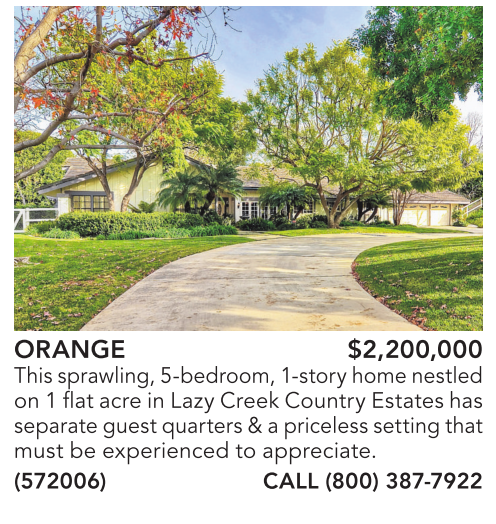 ORANGE $2,200,000 This sprawling, 5-bedroom,1-story home nestled on 1flat acre in Lazy Creek Country Estateshas separate guestquarters &apriceless settingthat must be experienced to appreciate. (572006) CALL (800) 387-7922