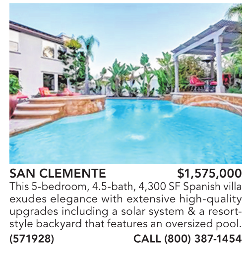 SAN CLEMENTE $1,575,000 This 5-bedroom,4.5-bath, 4,300SFSpanish villa exudes elegance with extensive high-quality upgrades including a solar system & a resortstyle backyard that features an oversized pool.