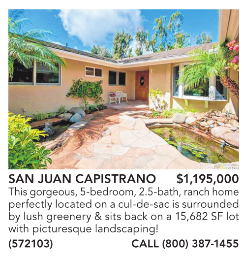 SAN JUAN CAPISTRANO $1,195,000 This gorgeous, 5-bedroom,2.5-bath, ranchhome perfectlylocatedonacul-de-sacissurrounded by lush greenery & sits back on a 15,682 SF lot with picturesque landscaping! (572103) CALL (800) 387-1455