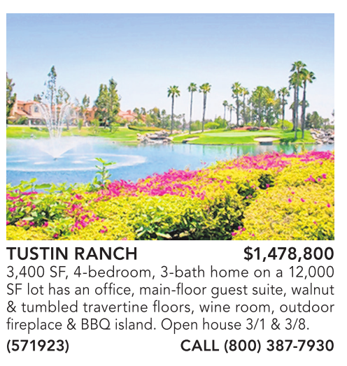 TUSTIN RANCH $1,478,800 3,400 SF, 4-bedroom, 3-bath home on a 12,000 SF lot has an office, main-floor guest suite, walnut & tumbled travertine floors, wine room, outdoor fireplace & BBQ island. Open house 3/1 & 3/8. (571923) CALL (800) 387-7930