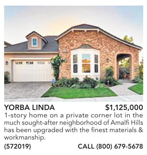 YORBA LINDA $1,125,000 1-story home on a private corner lot in the muchsought-afterneighborhood of AmalfiHills has been upgraded with the finest materials & workmanship. (572019) CALL (800) 679-5678