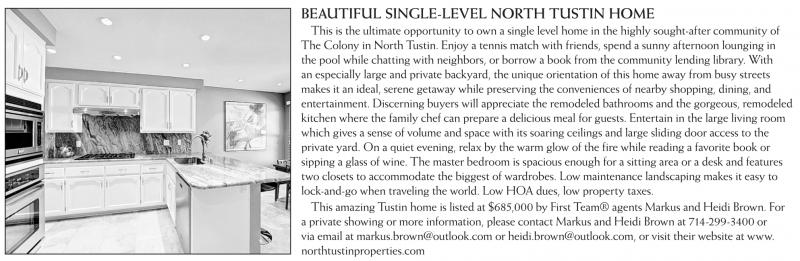 BEAUTIFUL SINGLE-LEVEL NORTH TUSTIN HOME This is the ultimate opportunity to own a single level home in the highly sought-after community of The Colony in North Tustin. Enjoy a tennis match with friends, spend a sunny afternoon lounging in the pool while chatting with neighbors, or borrow a book from the community lending library. With an especially large and private backyard, the unique orientation of this home away from busy streets makes it an ideal, serene getaway while preserving the conveniences of nearby shopping, dining, and entertainment. Discerning buyers will appreciate the remodeled bathrooms and the gorgeous, remodeled kitchen where the family chef can prepare a delicious meal for guests. Entertain in the large living room which gives a sense of volume and space with its soaring ceilings and large sliding door access to the private yard. On a quiet evening, relax by the warm glow of the fire while reading a favorite book or sipping a glass of wine. The master bedroom is spacious enough for a sitting area or a desk and features two closets to accommodate the biggest of wardrobes. Low maintenance landscaping makes it easy to lock-and-go when traveling the world. Low HOA dues, low property taxes. This amazing Tustin home is listed at $685,000 by First Team® agents Markus and Heidi Brown. For a private showing or more information, please contact Markus and Heidi Brown at 714-299-3400 or via email at markus.brown@outlook.com or heidi.brown@outlook.com, or visit their website at www. northtustinproperties.com