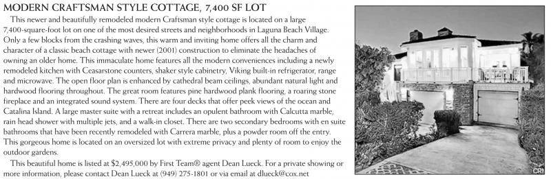 MODERN CRAFTSMAN STYLE COTTAGE, 7,400 SF LOT This newer and beautifully remodeled modern Craftsman style cottage is located on a large 7,400-square-foot lot on one of the most desired streets and neighborhoods in Laguna Beach Village. Only a few blocks from the crashing waves, this warm and inviting home offers all the charm and character of a classic beach cottage with newer (2001) construction to eliminate the headaches of owning an older home. This immaculate home features all the modern conveniences including a newly remodeled kitchen with Ceasarstone counters, shaker style cabinetry, Viking built-in refrigerator, range and microwave. The open floor plan is enhanced by cathedral beam ceilings, abundant natural light and hardwood flooring throughout. The great room features pine hardwood plank flooring, a roaring stone fireplace and an integrated sound system. There are four decks that offer peek views of the ocean and Catalina Island. A large master suite with a retreat includes an opulent bathroom with Calcutta marble, rain head shower with multiple jets, and a walk-in closet. There are two secondary bedrooms with en suite bathrooms that have been recently remodeled with Carrera marble, plus a powder room off the entry. This gorgeous home is located on an oversized lot with extreme privacy and plenty of room to enjoy the outdoor gardens. This beautiful home is listed at $2,495,000 by First Team® agent Dean Lueck. For a private showing or more information, please contact Dean Lueck at (949) 275-1801 or via email at dlueck@cox.net