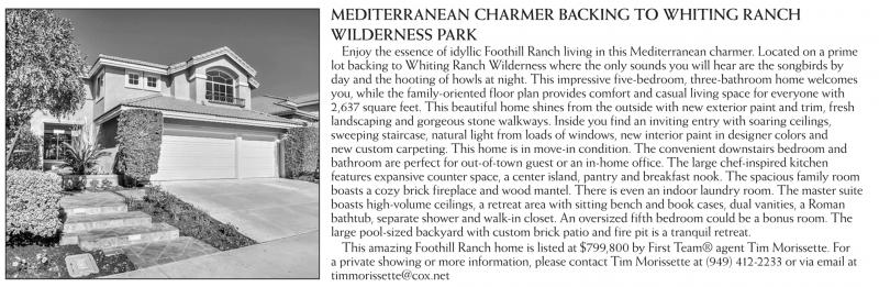 MEDITERRANEAN CHARMER BACKING TO WHITING RANCH WILDERNESS PARK Enjoy the essence of idyllic Foothill Ranch living in this Mediterranean charmer. Located on a prime lot backing to Whiting Ranch Wilderness where the only sounds you will hear are the songbirds by day and the hooting of howls at night. This impressive five-bedroom, three-bathroom home welcomes you, while the family-oriented floor plan provides comfort and casual living space for everyone with 2,637 square feet. This beautiful home shines from the outside with new exterior paint and trim, fresh landscaping and gorgeous stone walkways. Inside you find an inviting entry with soaring ceilings, sweeping staircase, natural light from loads of windows, new interior paint in designer colors and new custom carpeting. This home is in move-in condition. The convenient downstairs bedroom and bathroom are perfect for out-of-town guest or an in-home office. The large chef-inspired kitchen features expansive counter space, a center island, pantry and breakfast nook. The spacious family room boasts a cozy brick fireplace and wood mantel. There is even an indoor laundry room. The master suite boasts high-volume ceilings, a retreat area with sitting bench and book cases, dual vanities, a Roman bathtub, separate shower and walk-in closet. An oversized fifth bedroom could be a bonus room. The large pool-sized backyard with custom brick patio and fire pit is a tranquil retreat. This amazing Foothill Ranch home is listed at $799,800 by First Team® agent Tim Morissette. For a private showing or more information, please contact Tim Morissette at (949) 412-2233 or via email at timmorissette@cox.net