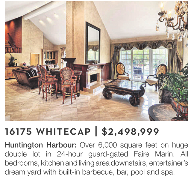Huntington Harbour: Over 6,000 square feet on huge double lot in 24-hour guard-gated Faire Marin. All bedrooms, kitchen and living area downstairs, entertainer’s dream yard with built-in barbecue, bar, pool and spa.