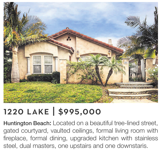 1220 LAKE | $995,000 Huntington Beach: Located on a beautiful tree-lined street, gated courtyard, vaulted ceilings, formal living room with fireplace, formal dining, upgraded kitchen with stainless steel, dual masters, one upstairs and one downstaris.