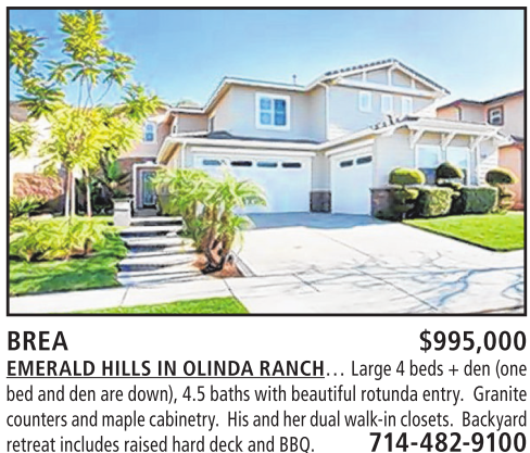 BREA $995,000 EMERALD HILLS IN OLINDA RANCH… Large 4beds+den(one bed and denare down), 4.5baths with beautifulrotunda entry. Granite countersand maplecabinetry. His andher dual walk-inclosets. Backyard retreatincludes raised hard deck andBBQ. 714-482-9100