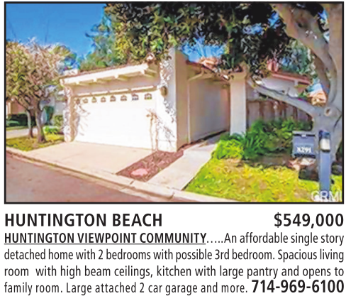 HUNTINGTON BEACH $549,000 HUNTINGTONVIEWPOINT COMMUNITY…..Anaffordable singlestory detachedhomewith2bedrooms with possible 3rdbedroom. Spacious living room with high beam ceilings, kitchen with large pantry and opens to family room.Large attached 2car garage and more. 714-969-6100