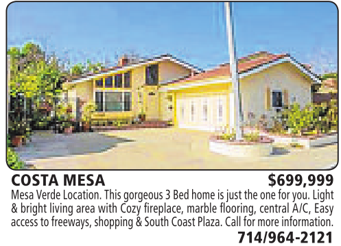 COSTA MESA $699,999 Mesa VerdeLocation. This gorgeous 3Bed homeisjust theone for you. Light &bright living area with Cozy fireplace, marble flooring, central A/C, Easy access to freeways, shopping &South CoastPlaza. Call formore information.